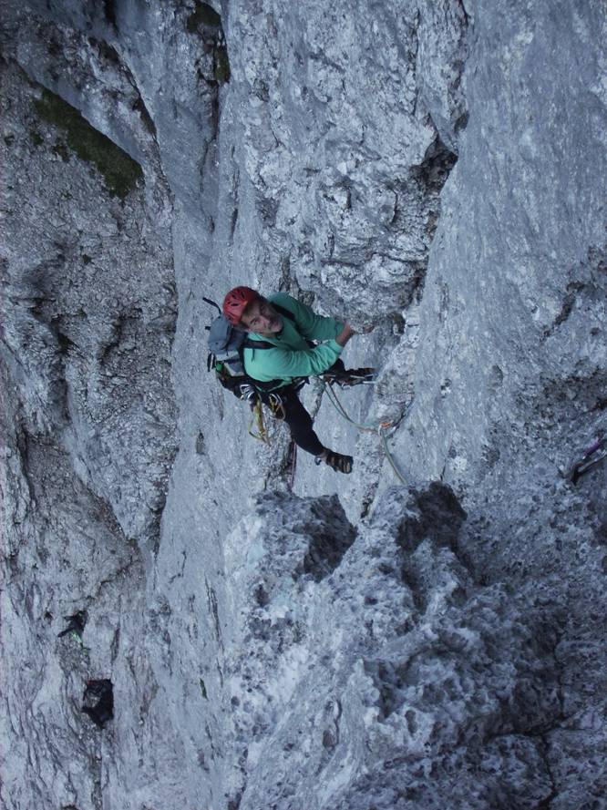 „Rätische Zeichen“ — Hans Hornauer bei der Erstbegehung, 3. Länge (7). >Nächstes Foto (Nr. 9 von 11) >Zurück zu Guffert-Nordwand |