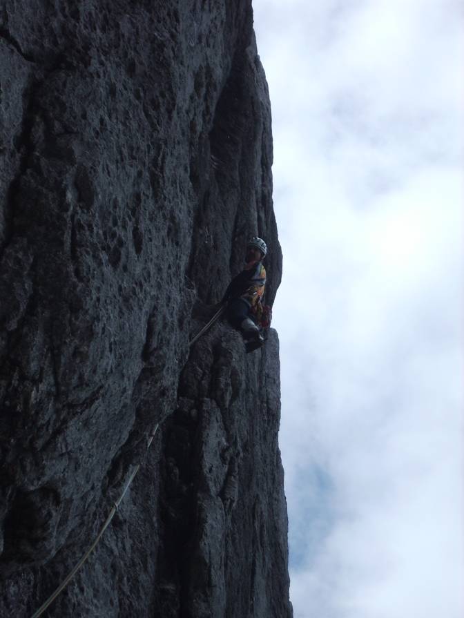 „Rätische Zeichen“ — Ralf Sussmann bei der Erstbegehung, 3. Länge (7).