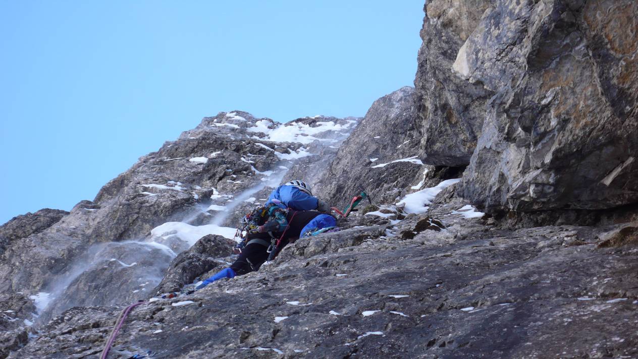 Ralf Sussmann bei der Erstbegehung in der 2. Länge (M5)