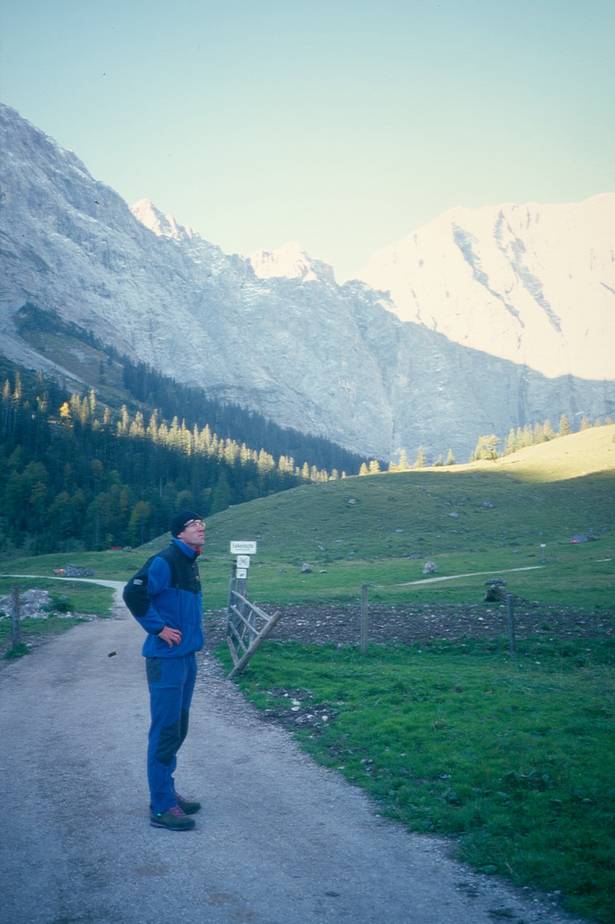 Richard Baur in der Eng vor Plattenspitze Nordwand (links) und Grubenkarspitze Nordostwand (rechts) Foto R. Sussmann >Nächstes Foto (Nr. 3 von 15) >Zurück zur Karwendel-Übersicht |