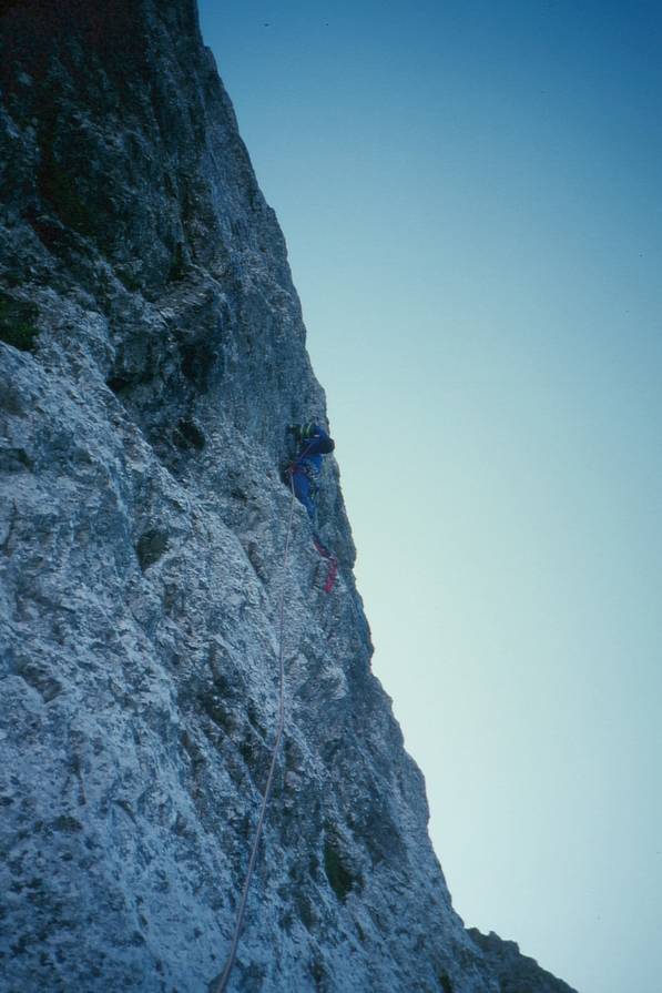 „Im Schatten der Sphinx“ - Richard Baur in der 8. Seillänge bei der Erstbegehung Foto: Archiv Baur >Nächstes Foto (Nr. 8 von 15) >Zurück zur Karwendel-Übersicht |