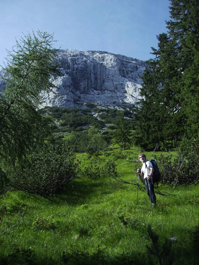 „Rätische Zeichen“ — hier geht es vom Wanderweg ab und rechts zur Nordwand hoch. >Nächstes Foto (Nr. 2 von 11) >Zurück zu Guffert-Nordwand