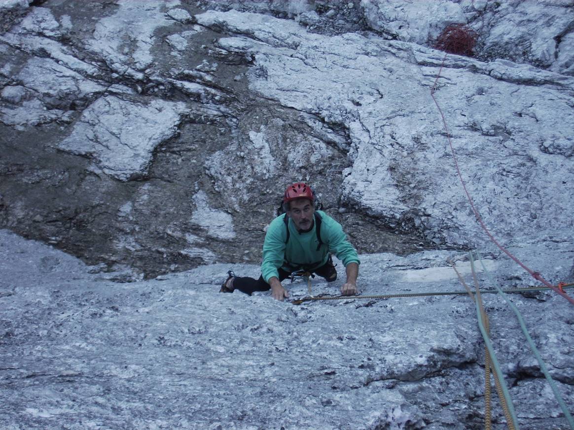 „Rätische Zeichen“ — Hans Hornauer bei der Erstbegehung. Blick aus der ersten Länge (7+/8-) zum Einstieg. >Nächstes Foto (Nr. 3 von 11) >Zurück zu Guffert-Nordwand |