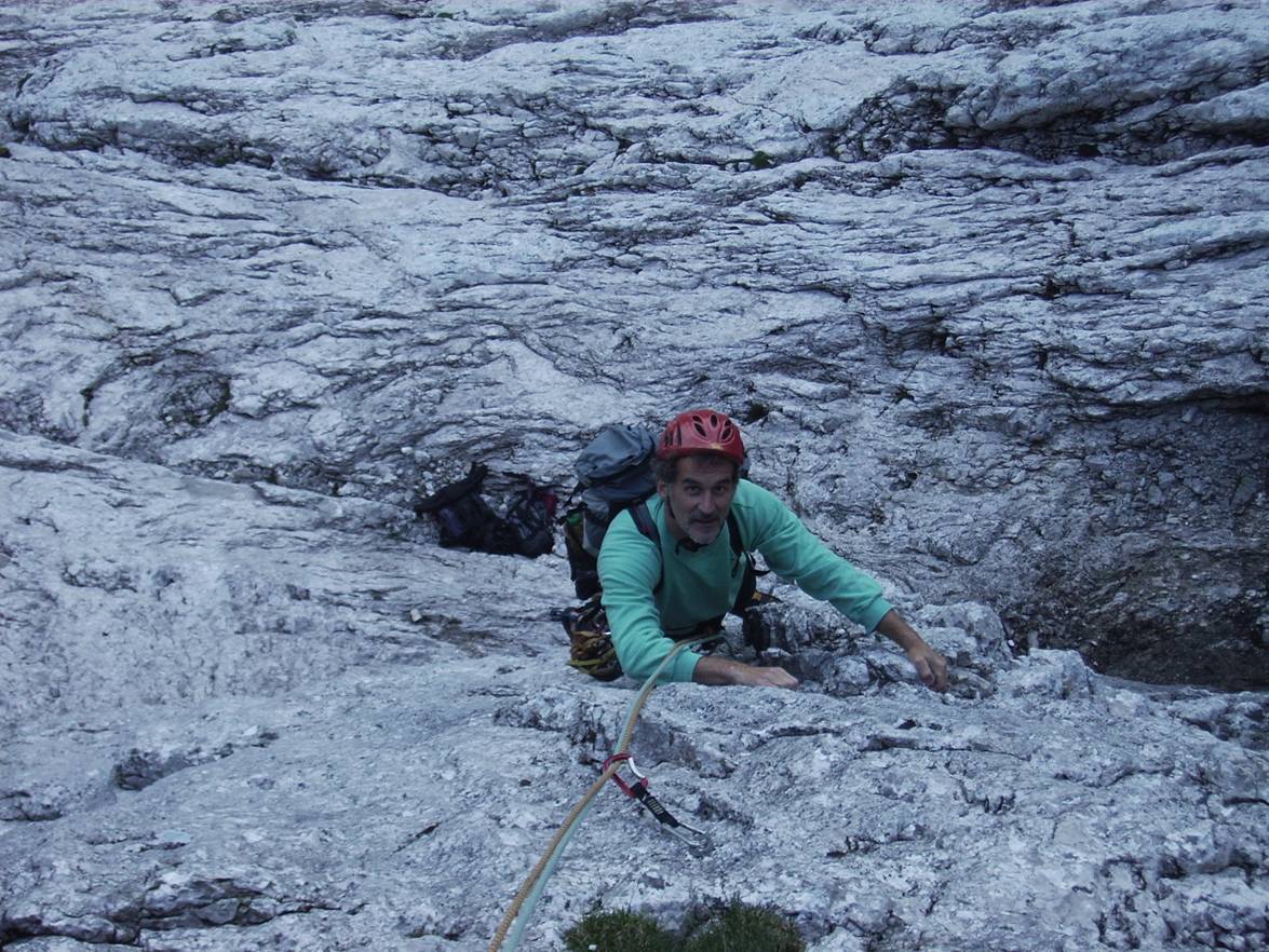 „Rätische Zeichen“ — Hans Hornauer bei der Erstbegehung. Blick aus der ersten Länge (7+/8-) zum Einstieg. >Nächstes Foto (Nr. 4 von 11) >Zurück zu Guffert-Nordwand |