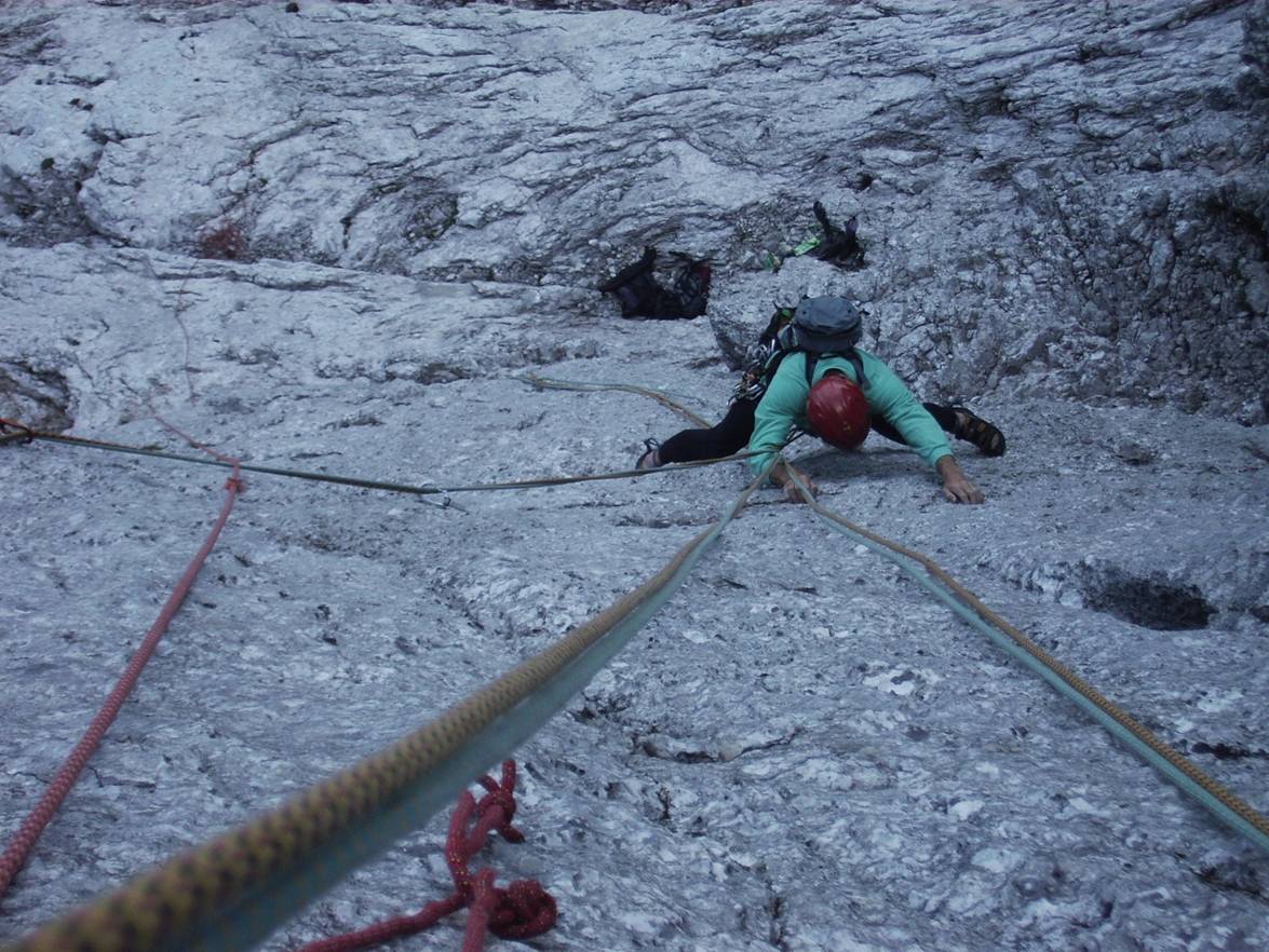 „Rätische Zeichen“ — Hans Hornauer bei der Erstbegehung. Blick aus der 2. Länge (7+) zum Einstieg. >Nächstes Foto (Nr. 5 von 11) >Zurück zu Guffert-Nordwand |