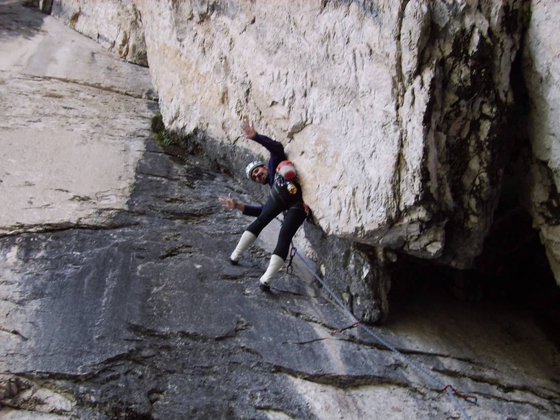 „Riesendach-Verschneidung“ — R. Sussmann im Handless Rest der 6. Länge (8-) >Nächstes Foto (Nr. 2 von 8) >Zurück zur Karwendel-Übersicht |